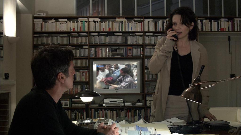 SOBRE A QUESTÃO METACINEMATOGRÁFICA DO FILME, E SEM CAIR EM SOBRE-ANÁLISE NO QUE SE CALHAR É SOMENTE O FACE-VALUE DO OBJETO DOS VÍDEOS DE VIGILÂNCIA E OS SEUS ‘ESPECTADORES’ NO FILME, NUMA RELAÇÃO TAMBÉM DE TRAUMA, VEJAMOS COMO ESTAS CAMADAS EXISTEM ATÉ MESMO A UM NÍVEL DE DECISÕES FORMAIS E DE MONTAGEM NO FILME. A CÂMARA OBSERVA DE UM MODO ASSUSTADORAMENTE PRÓXIMO. NÃO PELOS CLOSE-UPS, MAS SIM PELA CLARA ILUSÃO DE FAZER COM QUE CENAS QUE NÃO FAZEM PARTE DOS TAIS VÍDEOS DEIXADOS NA CASA DE GEORGES PAREÇAM ESTAR A SER FILMADAS DE UM MODO APARENTEMENTE AMADOR. HÁ MOMENTOS EM QUE QUASE CONSEGUIMOS CONTAR OS PASSOS QUE O OPERADOR DE CÂMARA DÁ NUM GESTO DE MOVIMENTO OBJETIVO DA LENTE. ISTO combinado COM A MONTAGEM QUE ARBITRARIAMENTE NÃO PONTUA AS TRANSIÇÕES ENTRE SONHOS, NARRATIVA PRINCIPAL E IMAGENS DE VÍDEO, E EM CONJUNTO TAMBÉM COM AS CAMADAS DE IMAGEM EM MOVIMENTO NA MISE-EN-SCÈNE, SEJAM ELAS PLANOS DENTRO DE PLANOS OU MOMENTOS MAIS ÓBVIOS DE POR EXEMPLO TELEVISORES A PASSAR NOTICIÁRIOS, PROPICIA AO ESPECTADOR NÃO SÓ UMA FÚTIL DESORIENTAÇÃO, MAS UMA IMERSÃO PROFUNDA COM A PRÓPRIA IDEIA DE CINEMA, VÍDEO, VIGILÂNCIA, INFORMAÇÃO, COMUNICAÇÃO, E TODOS OS OUTROS TEMAS QUE ABORDA.
